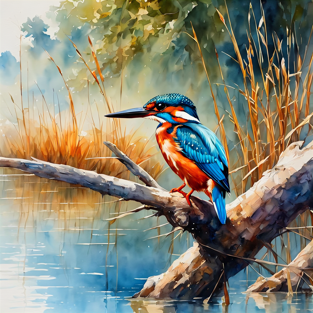A beautiful kingfisher perched on a dried tree beach in a river,blue water ,reeds plants insects serene , stunning masterpiece, vivid water colour , detailed on white chart paper