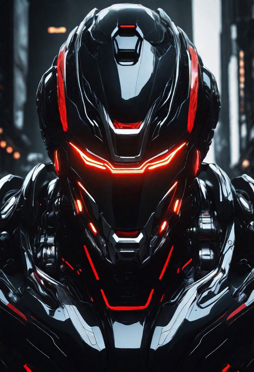 man, male, black, glossy, red lights, symmetric, fully mecha, mecha face, robot, cyborg, helm, helmet, mask, glowing details, detailed background, highly detailed, 4k, high resolution, high quality, deep detailed,