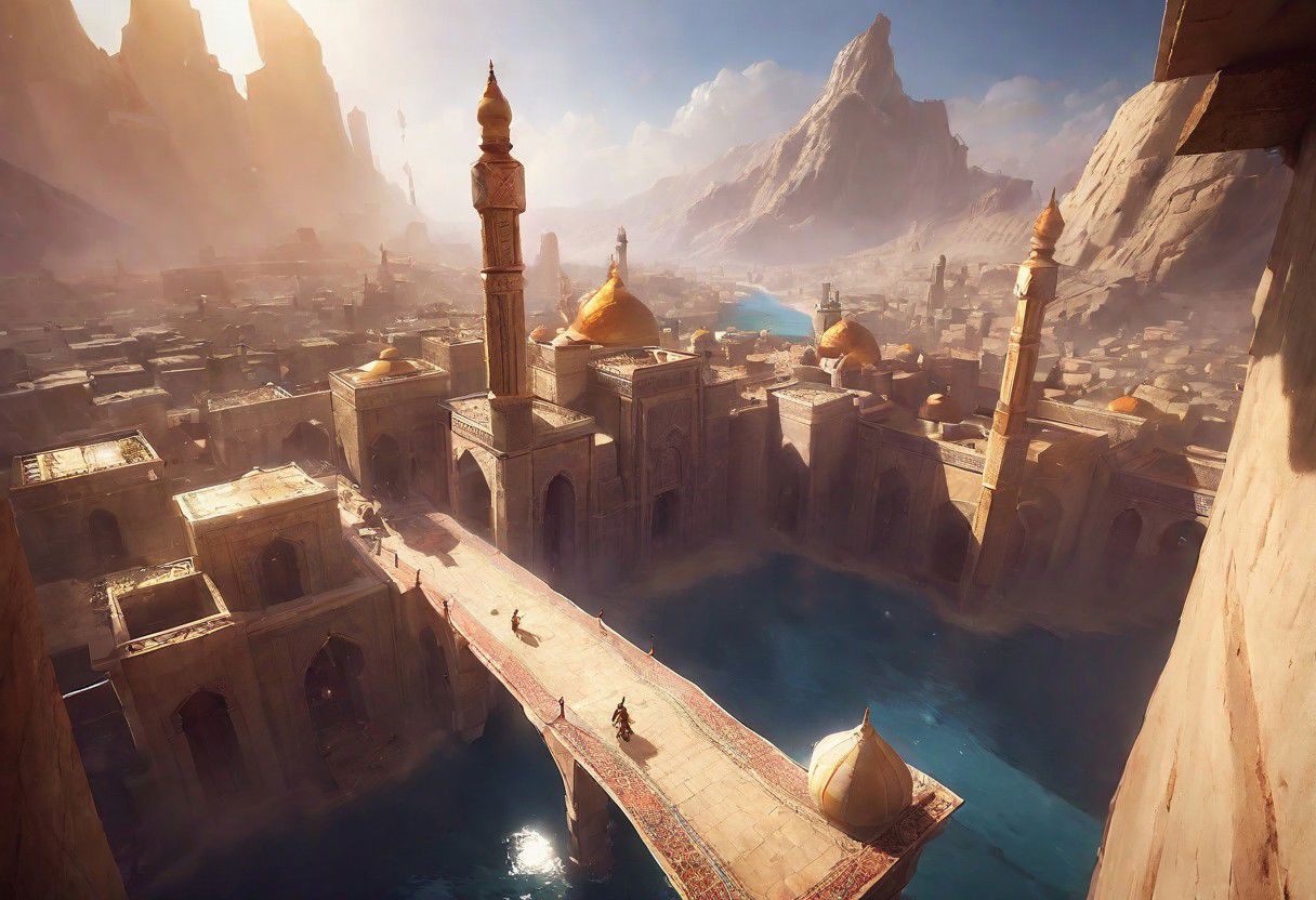 Craft a captivating image showcasing Prince of Persia's world, emphasizing the game's visual appeal with imaginative lighting. Create a detailed composition that would catch the eye on ArtStation.
