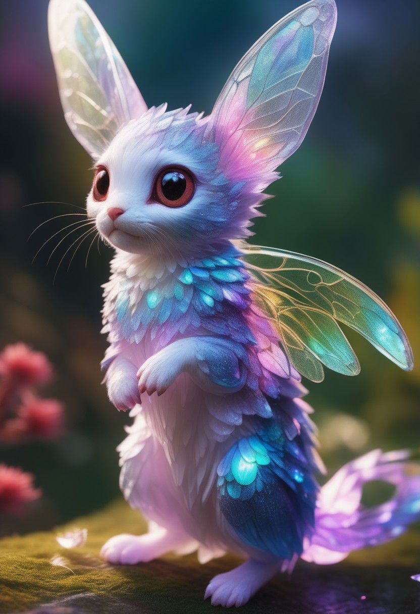 hyper detailed masterpiece, dynamic, awesome quality, tiny creature, delicate (ethereal appearance 1.3), (transparent | iridescent wings 1.66), pointed ears, playful mischievous expression, nature inspired clothing, magical accessories, enchantment realm, Malevolent, no background, dynamic colorful background, solid colors only with (Heavy Bokeh1.5), Caustic Lighting Effects, RTX, BY HGHD