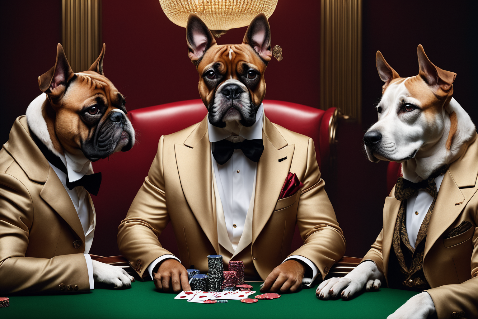 ((best quality)), ((masterpiece)), ((realistic)), (detailed), a group of (anthropomorphic) dog-men_dressed_in_a_beige_smoking_jackets sipping Martinis playing poker((facial expressions of joy, not showing cards)) (( many chips on the table))around a table, cigar smoke in the air, ashtray on the table, fantasy, beautiful, dynamic pose, amazing, highly detailed, photorealism, sharp focus, absurdres, Nikon Z9, 16k