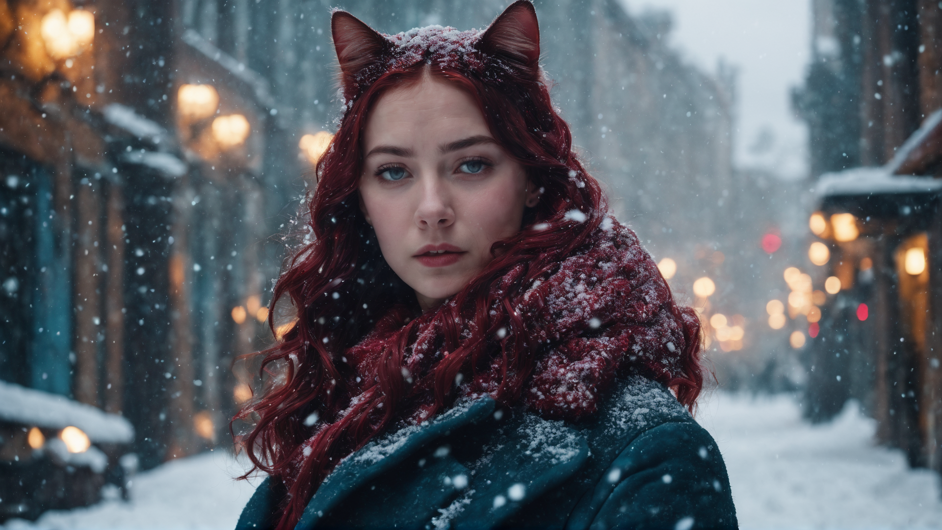 cinematic photo [ (art by Charles Vess:1.0) : (art by Constantin Joffe:1.2) :9], Irritated [Silky|Colossal] Victoria, stylized, Slimy electric color and dark red hair, Snowing, <lora:add-detail-xl:2>cat . 35mm photograph, film, bokeh, professional, 4k, highly detailed
