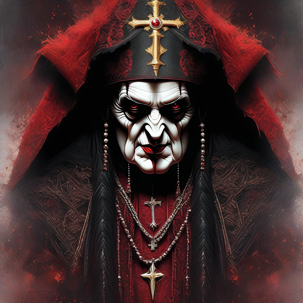 evil bloody cannibalistic pope with shabby fraying robes with ornamental stitchwork, wearing a big gothic pope hat, hyper detailed, ultra-high quality, dynamic lighting, grim, dark, goth, lifelike