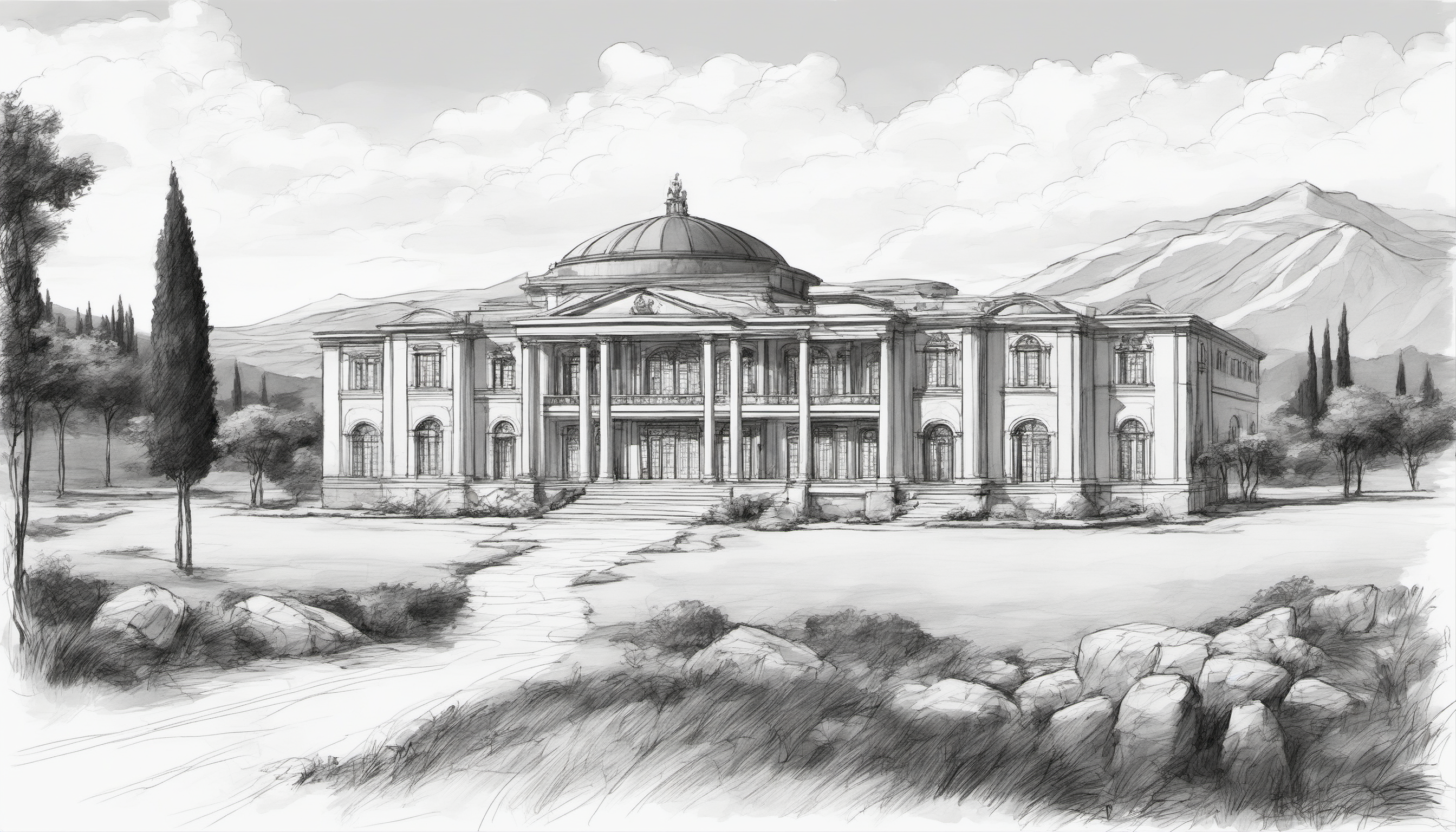 A landscape sketch of a luxurious imperial roman estate nestled in a broad plain, set against the far off backdrop of an imposing jagged mountain range, landscape, symmetrical, luxurious, imperial roman estate, plains