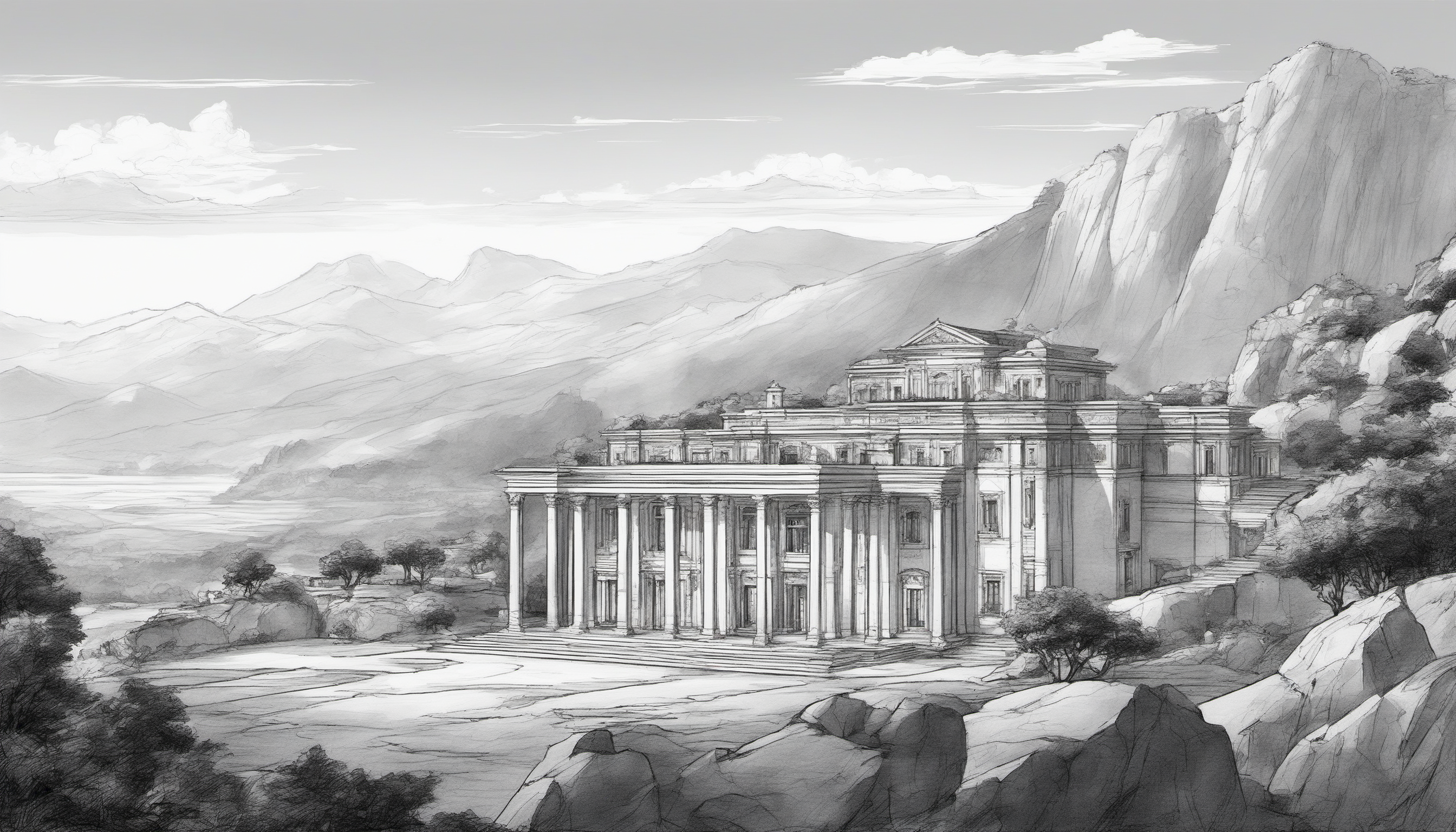 A landscape sketch of a luxurious imperial roman estate nestled in a broad plain, set against the far off backdrop of an imposing jagged mountain range, landscape, symmetrical, luxurious, imperial roman estate, plains