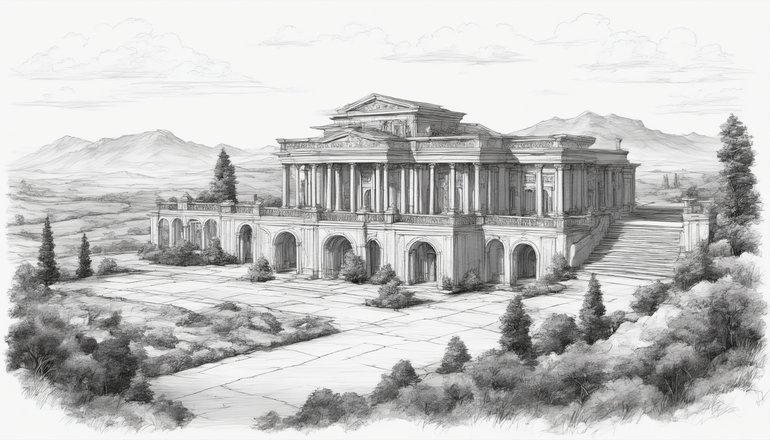 A landscape sketch of a luxurious imperial roman estate nestled in a broad plain, set against the far off backdrop of an imposing jagged mountain range, landscape, symmetrical, luxurious, imperial roman estate, plains