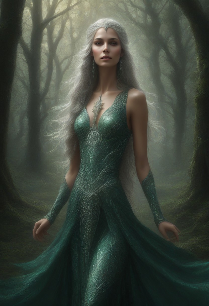photo of serene, elegant elvish girl with long, flowing, silver hair that reaches her waist, wearing an intricate, flowing gown made of shimmering, iridescent fabric, adorned with delicate, glowing runes of Matrix Code digital rain. She holds a slender, elegant staff topped with a luminous, crystal orb, standing in a mystical, moonlit forest with ancient, towering trees and soft, ethereal light casting a gentle glow. Green eyes (looking at viewer), (elf_ears)