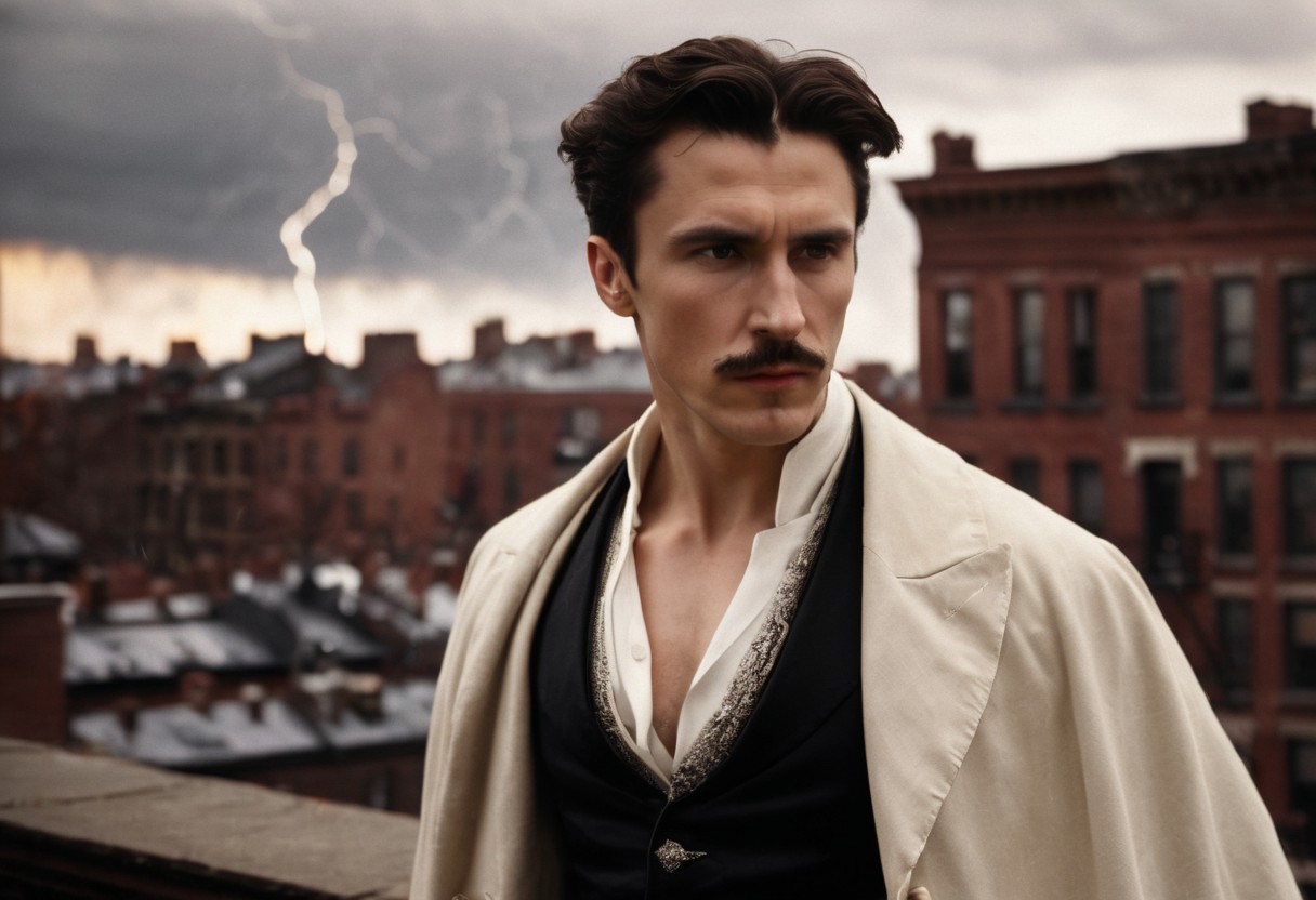 A slim young man Nicola Tesla, shirtless standing on a New York brownstone rooftop in the 19th century, the wind whipping his hair. electrical storm rages in the sky. relaxed expression, closeup, sharp focus, portrait quality, dramatic, bokeh