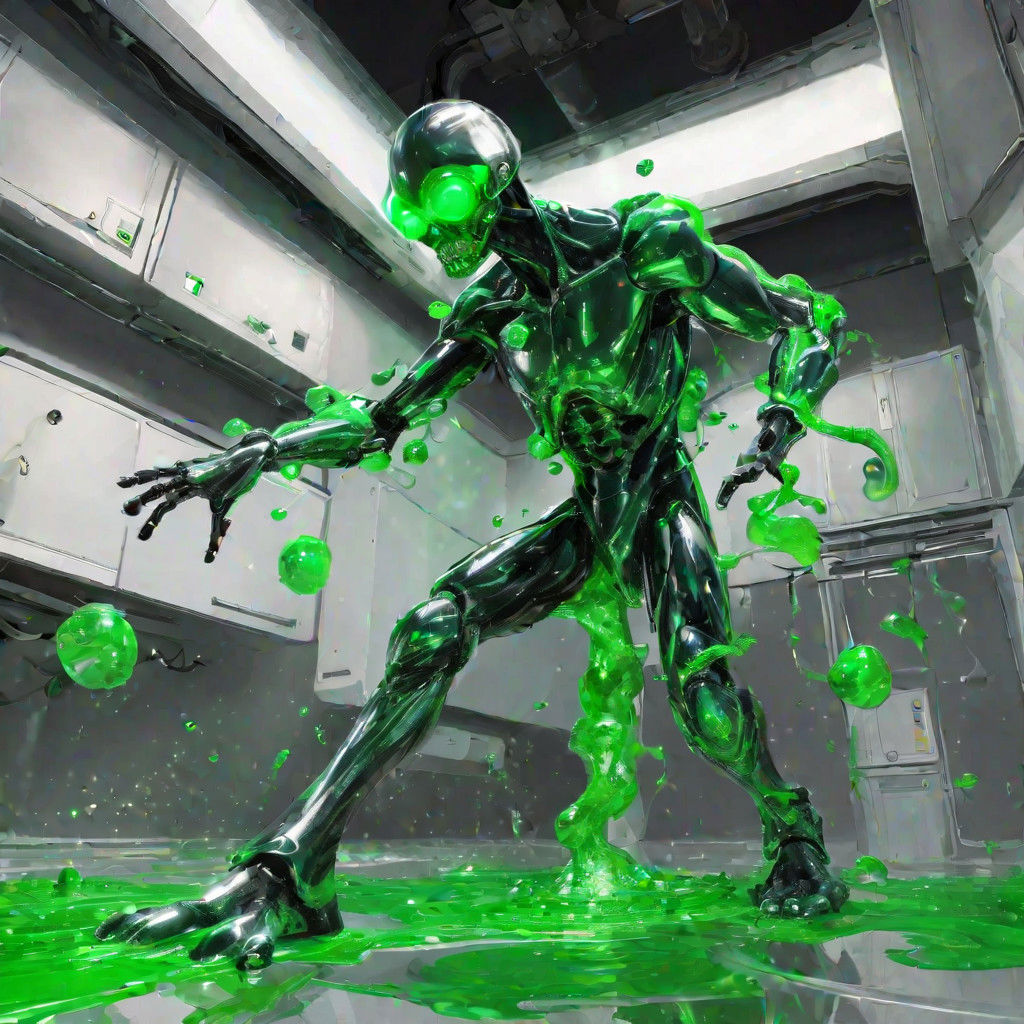 a mass of green goo. He can change shape at will via his anti-gravity projector. His most common form is a humanoid shape, but he can alter it in a variety of ways due to his lack of a skeletal structure. His gravity projector is silver, black, and green. Usually, it floats above him to stabilize his form.
