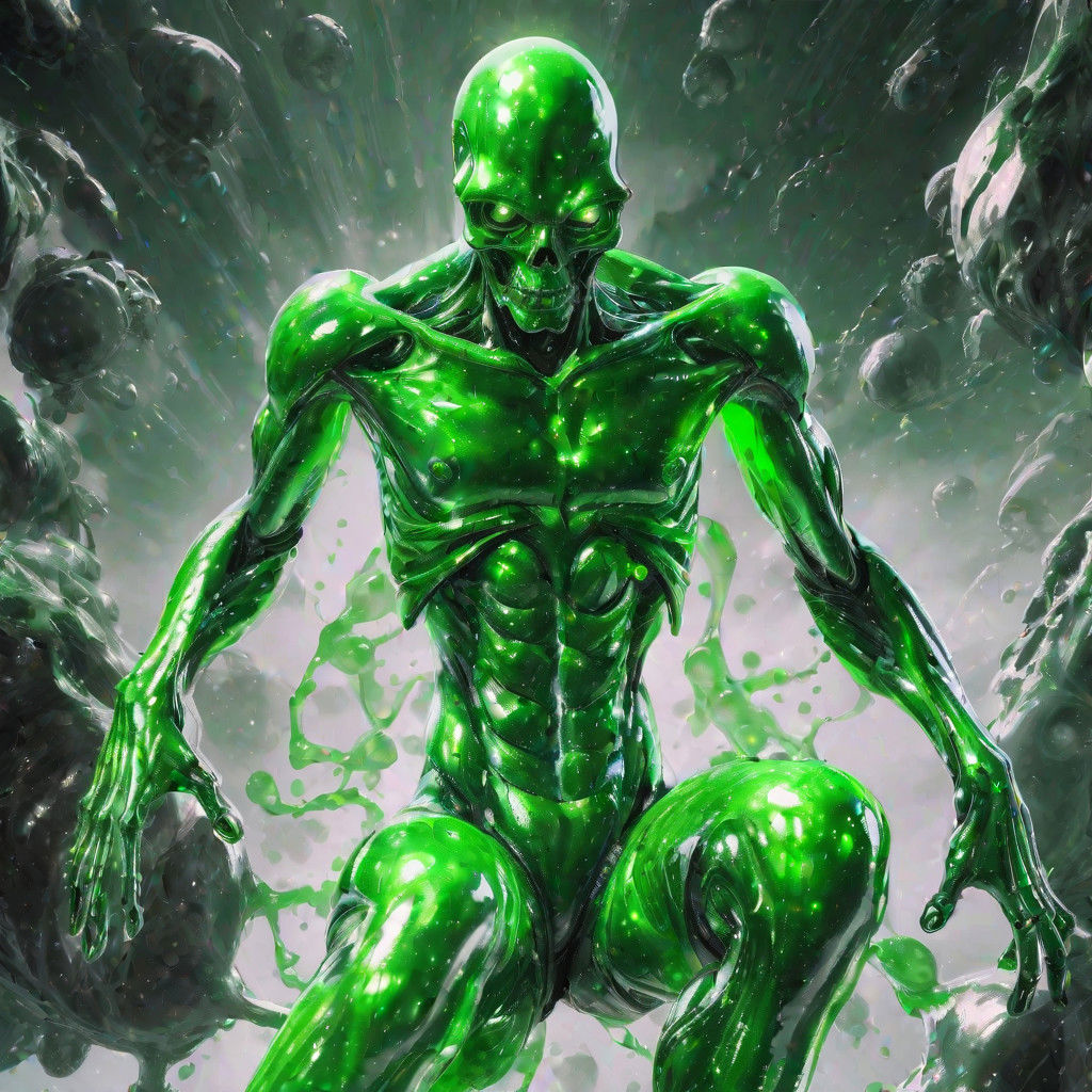 a mass of green goo. He can change shape at will via his anti-gravity projector. His most common form is a humanoid shape, but he can alter it in a variety of ways due to his lack of a skeletal structure. His gravity projector is silver, black, and green. Usually, it floats above him to stabilize his form.