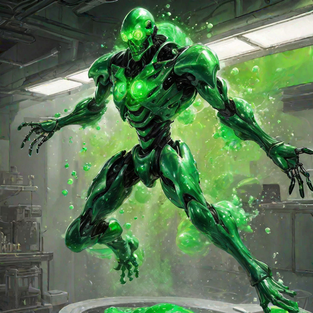 a mass of green goo. He can change shape at will via his anti-gravity projector. His most common form is a humanoid shape, but he can alter it in a variety of ways due to his lack of a skeletal structure. His gravity projector is silver, black, and green. Usually, it floats above him to stabilize his form.