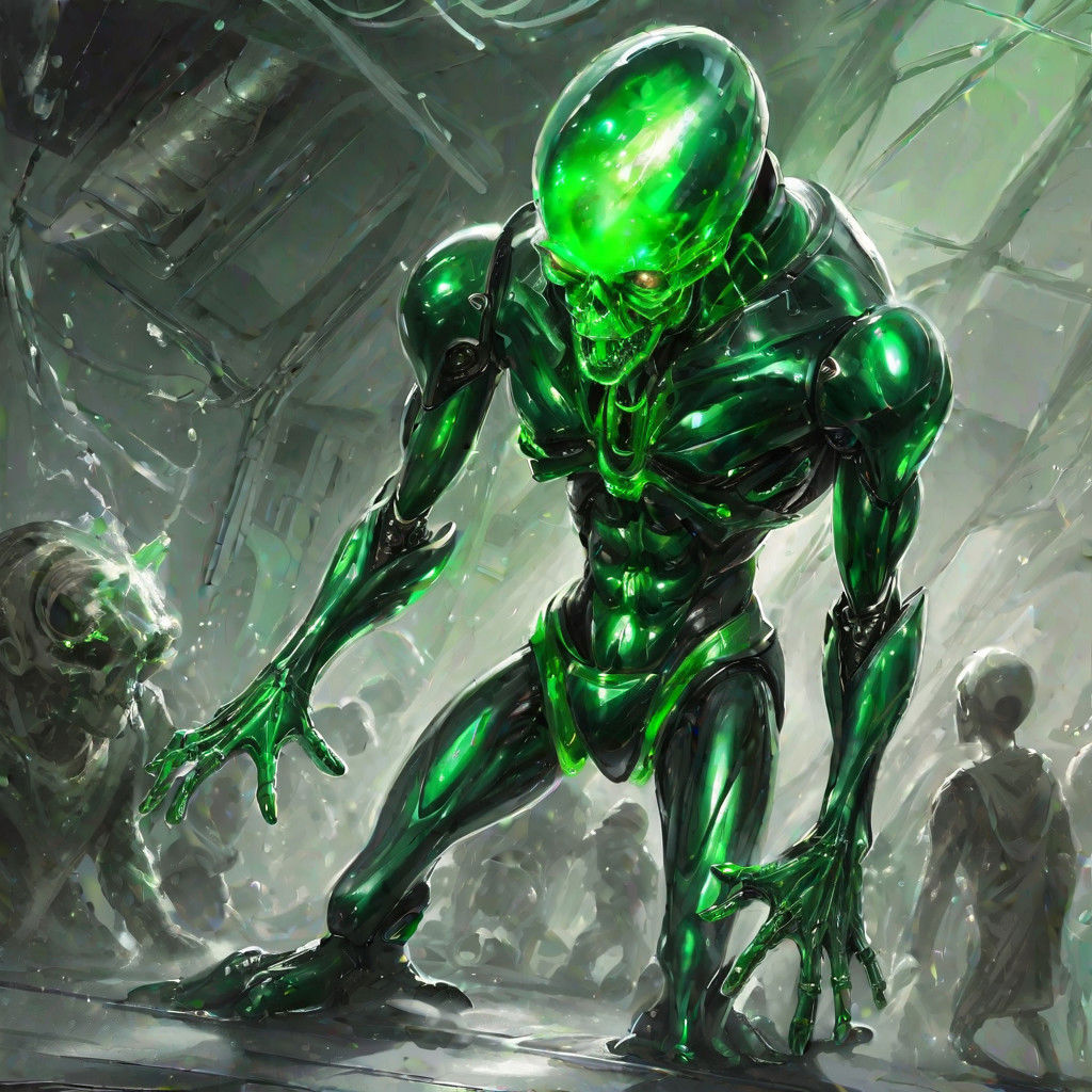 a mass of green goo. He can change shape at will via his anti-gravity projector. His most common form is a humanoid shape, but he can alter it in a variety of ways due to his lack of a skeletal structure. His gravity projector is silver, black, and green. Usually, it floats above him to stabilize his form.