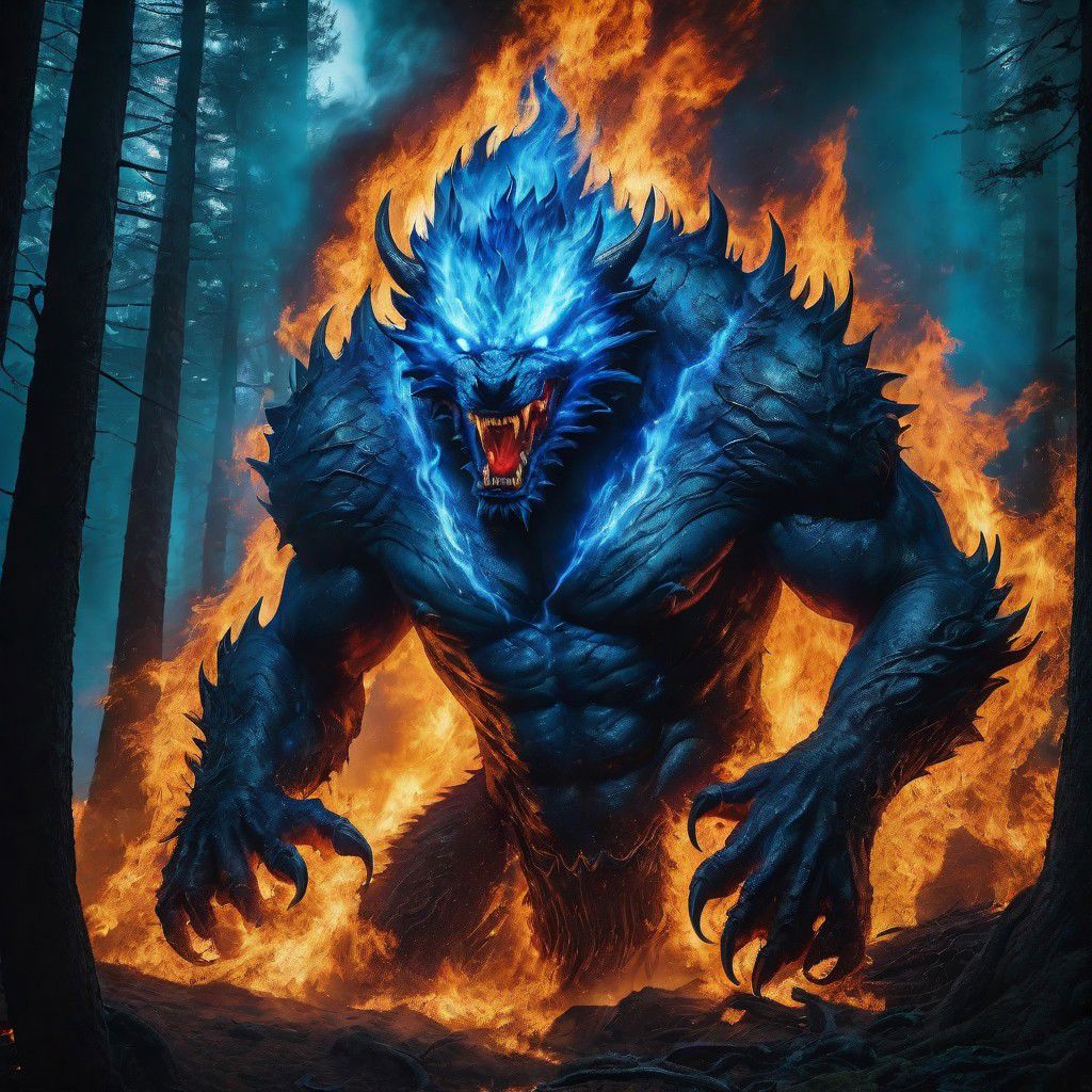 Monstrous forest blue fire with the fierce face of a fire monster, engulfed in blue firey conditions, swirling flames, and buffeting blue fire. Cinematic, mysterious, sinister, scary, wild, deadly, and beastly. A nightmarish masterpiece.