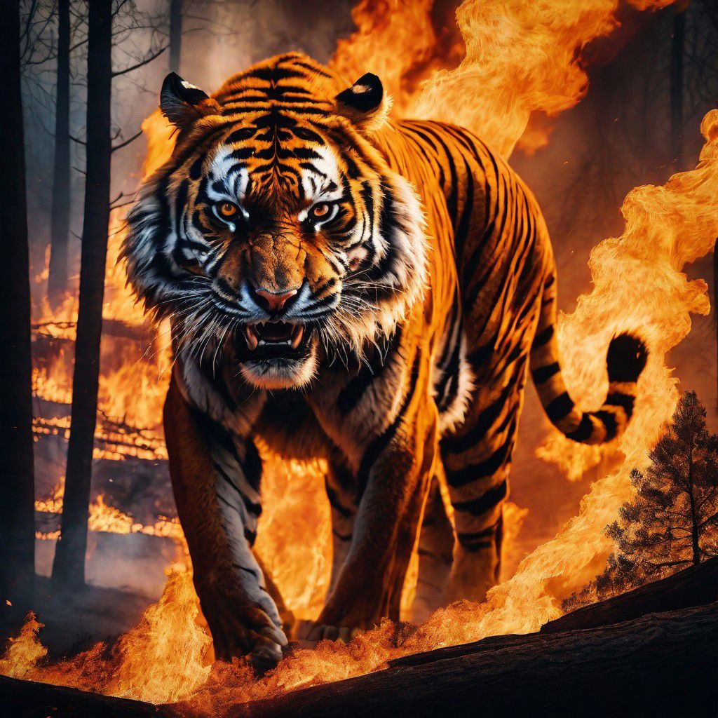 Monstrous forest fire with the fierce face of a tiger, engulfed in firey conditions, swirling flames, and buffeting fire. Cinematic, mysterious, sinister, scary, wild, deadly, and beastly. A nightmarish masterpiece.
