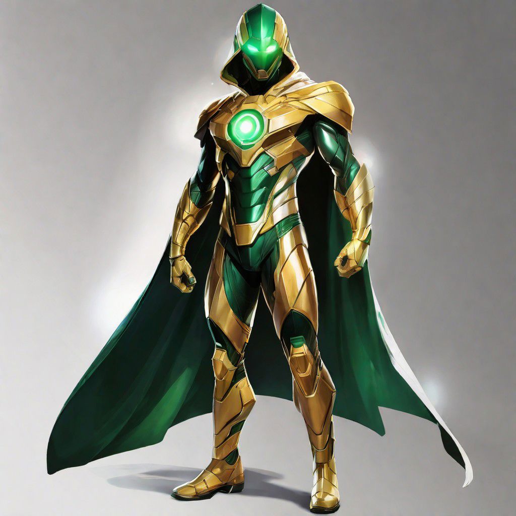 a hero wearing a green and gold costume with futuristic details. The suit should look technological and advanced, with bright lines and cybernetic elements. The hero must wear a white hood that covers his head but leaves his face exposed, and a white cape that extends from his left shoulder to his left ankle, giving him an asymmetrical and dynamic look. The hood and cape should have an elegant and fluid appearance, suggesting movement even when the hero is stationary. Feel free to add any other details or accessories you see fit to enhance the futuristic aspect of the hero. Remember that the main emphasis is on the design of the costume, hood and cape, and your creativity is welcome to make the hero unique and impressive.