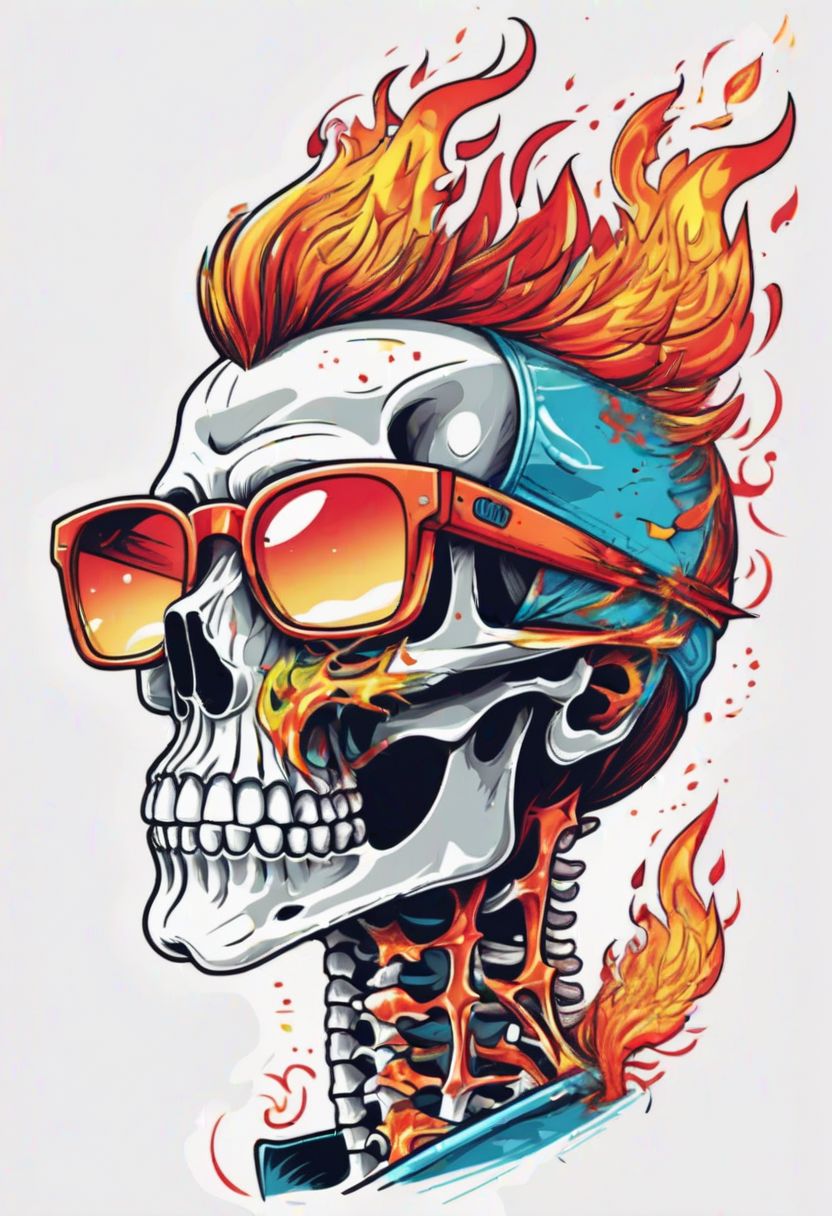 illustration skeleton wearing trendy sunglasses with fire Bones Botany, side view, sticker, clean white background, professional vector, high detail, t-shirt design, graffiti, vibrant,
