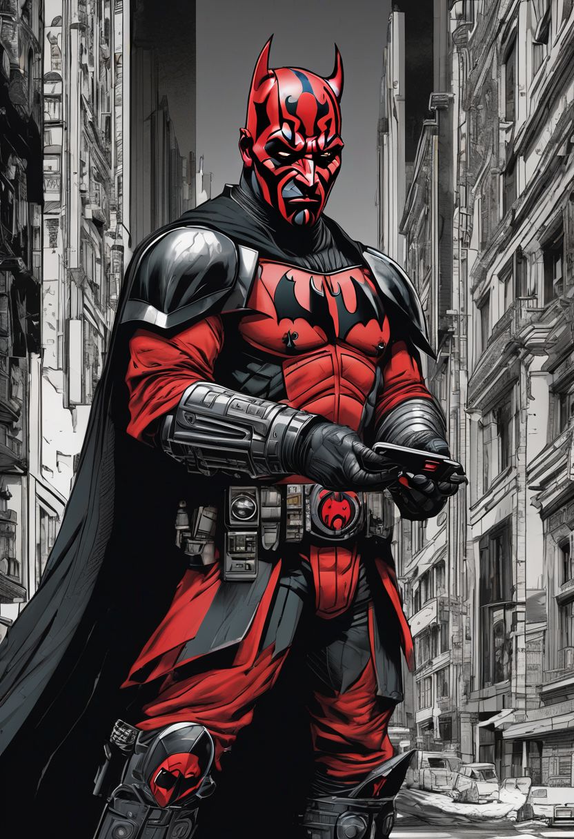 Darth Maul, in the style of street art aesthetic, cute cartoonish designs, photo-realistic techniques, dark red, childhood arcadias, anime aesthetic, cartoon-like figures:::::::::::batman holding a phone, in the style of , realistic hyper-detail, rob liefeld, close-up intensity, george stefanescu, nathan wirth, 32k resolution