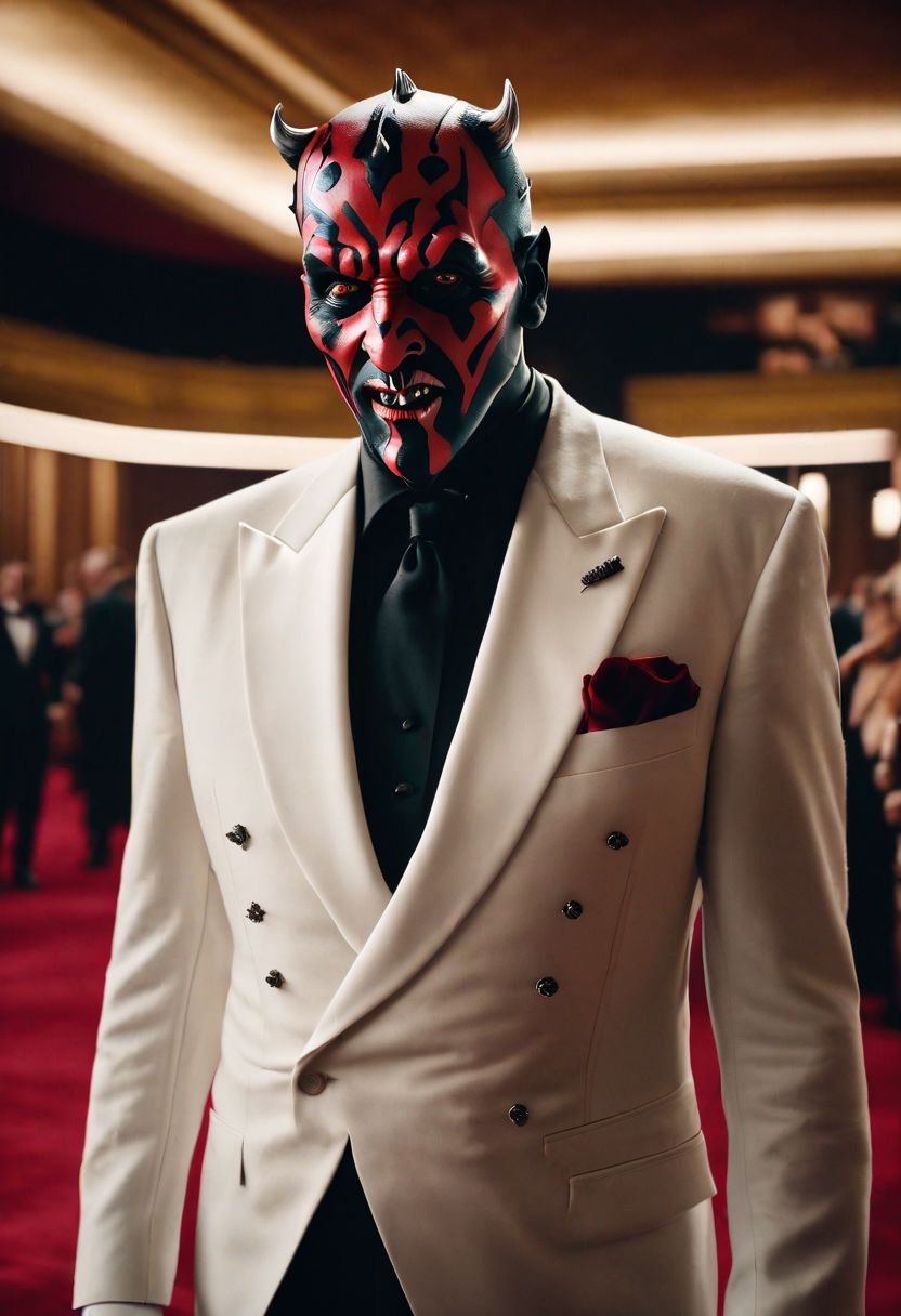 "A full body cinematic film still of a screen accurate Darth Maul smiling and wearing a sharp white tuxedo with black tie and red pocket square at the Oscars" Weight:1.5 "intricate details, HDR, beautifully shot, hyperrealistic, sharp focus, 64 megapixels, 16k resolution, shot on DSLR, perfect composition, molecular precision, high contrast, cinematic, atmospheric, moody, photorealistic, hyper detailed, tilt shift, cinematic color film still. UHD. Weight:1.1