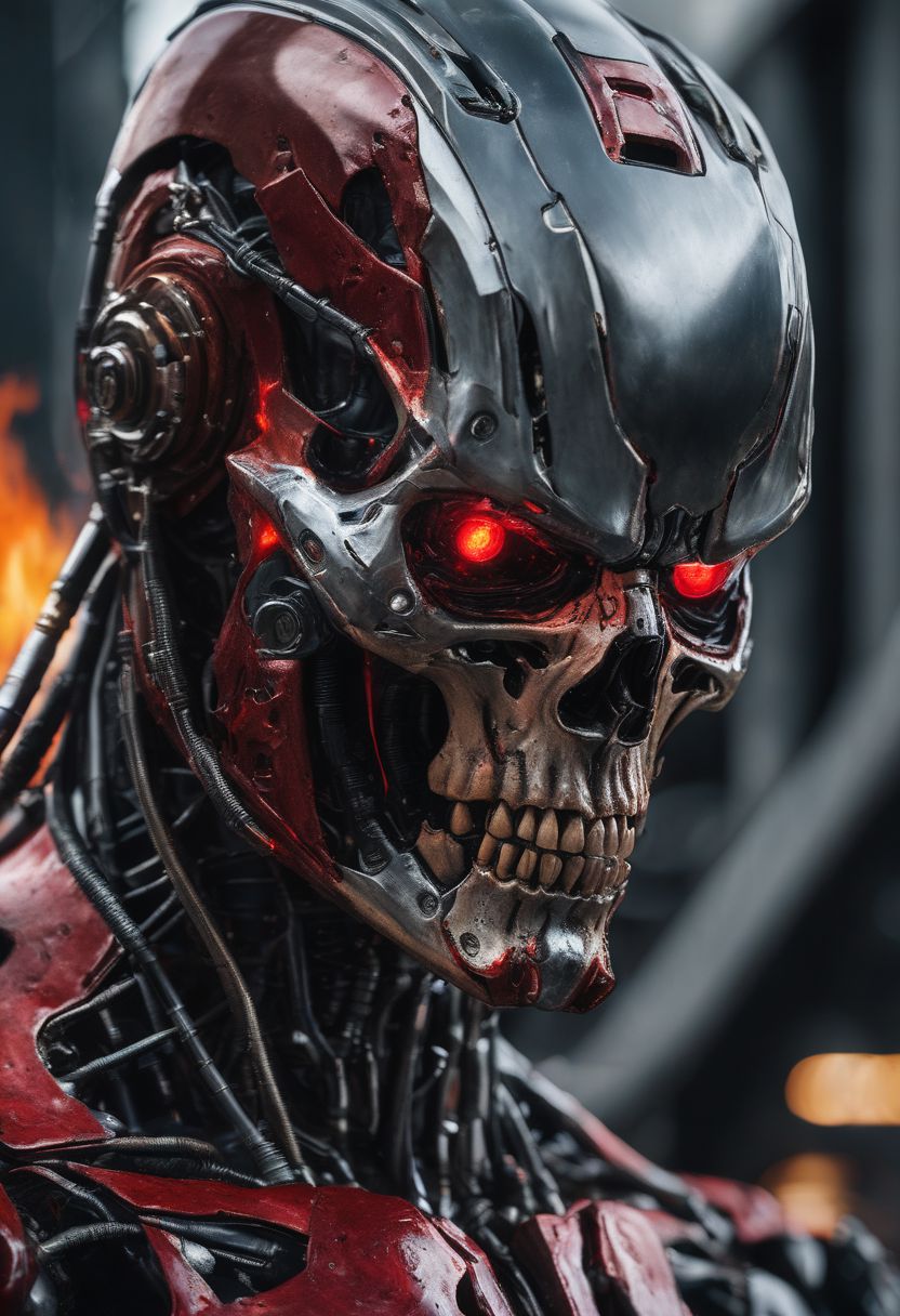 Terrifying Terminator girl, T-800, ultra realistic 8K, HDR, Cyborg, sci-fy, Realistic eyes, Cyborg Red Eyes, wavy red hair, broken bloody face, Half a cyborg face, Half of a cyborg's face and skull, cyborg sinister by Greg Rutkowski, red as complementary colours, fire, a bloody, burning female body uncovered, Photograph Taken on Nikon D750, Intricate, Elegant, Digital Illustration, Scenic, full body, HyperRealistic, HyperDetailed, Unreal Engine, CryEngine, Octane Render, Attractive, Atrractive bust girl, attractive 20 years old woman, very gory