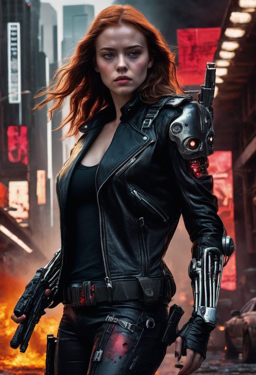 Ultra-realistic digital painting of an Terrifying Sadie Sink as Terminator woman, T-800, ultra realistic 8K, HDR, Cyborg, Leather black Jacket, sci-fy, Realistic Cyborg Red Eye, wavy red hair, broken bloody face, Sinister Terminator woman, Half of a cyborg skeleton face, cyborg sinister by Greg Rutkowski, standing defiantly amidst a dark street, sinister ruined street city, blood-stained and smeared with dirty, red as complementary colours, fire, Photograph Taken on Nikon D750, Intricate, Elegant, Digital Illustration, Scenic, full body, HyperRealistic, HyperDetailed, Unreal Engine, CryEngine, Octane Render, ctive, defiant and seductive, covered in dirty and blood, cinematic colors Lighting, extremely detailed, 8K, Attractive