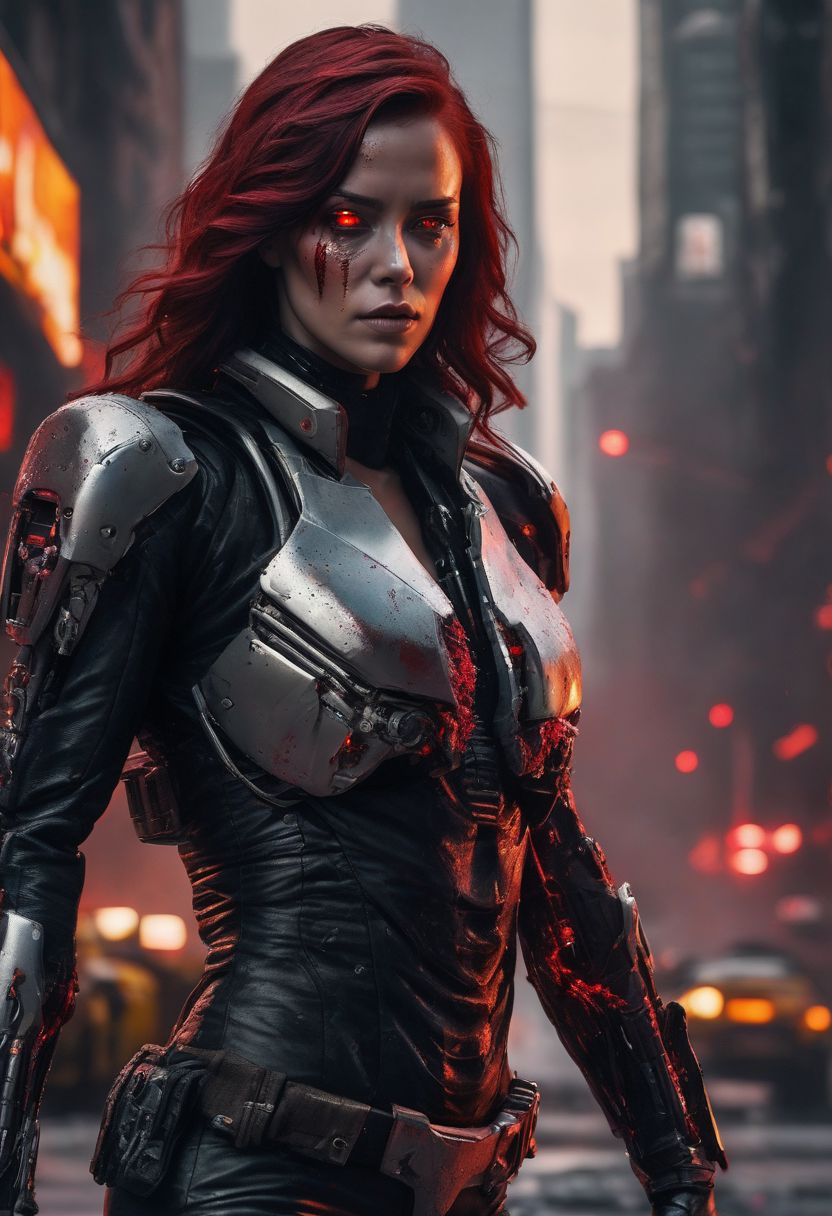 Ultra-realistic digital painting of an Terrifying Terminator girl,T-800, ultra realistic 8K, HDR, Cyborg, Leather black Jacket, sci-fy, Realistic red eyes, Cyborg Red Eye, wavy red hair, broken bloody face, Sinister Sadie Sink as Terminator girl, Half a cyborg face, cyborg sinister by Greg Rutkowski, standing defiantly amidst a dark street, sinister ruined street city, blood-stained and smeared with dirty, red as complementary colours, fire, Photograph Taken on Nikon D750, Intricate, Elegant, Digital Illustration, Scenic, full body, HyperRealistic, HyperDetailed, Unreal Engine, CryEngine, Octane Render, ctive, defiant and seductive, covered in dirt and blood, cinematic colors Lighting, extremely detailed, 8K, Attractive