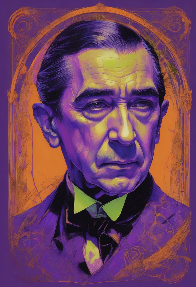 Hyperintricate art nouveau, baroque, caricature sketch of Bela Lugosi, lost in emotion and dread, ultrarealism, hyperdetail vantablack on electric purple with chartreuse and neon glow orange lines photoluminescent by Ken dallmier in the style of Carne Griffiths and James Christensen
