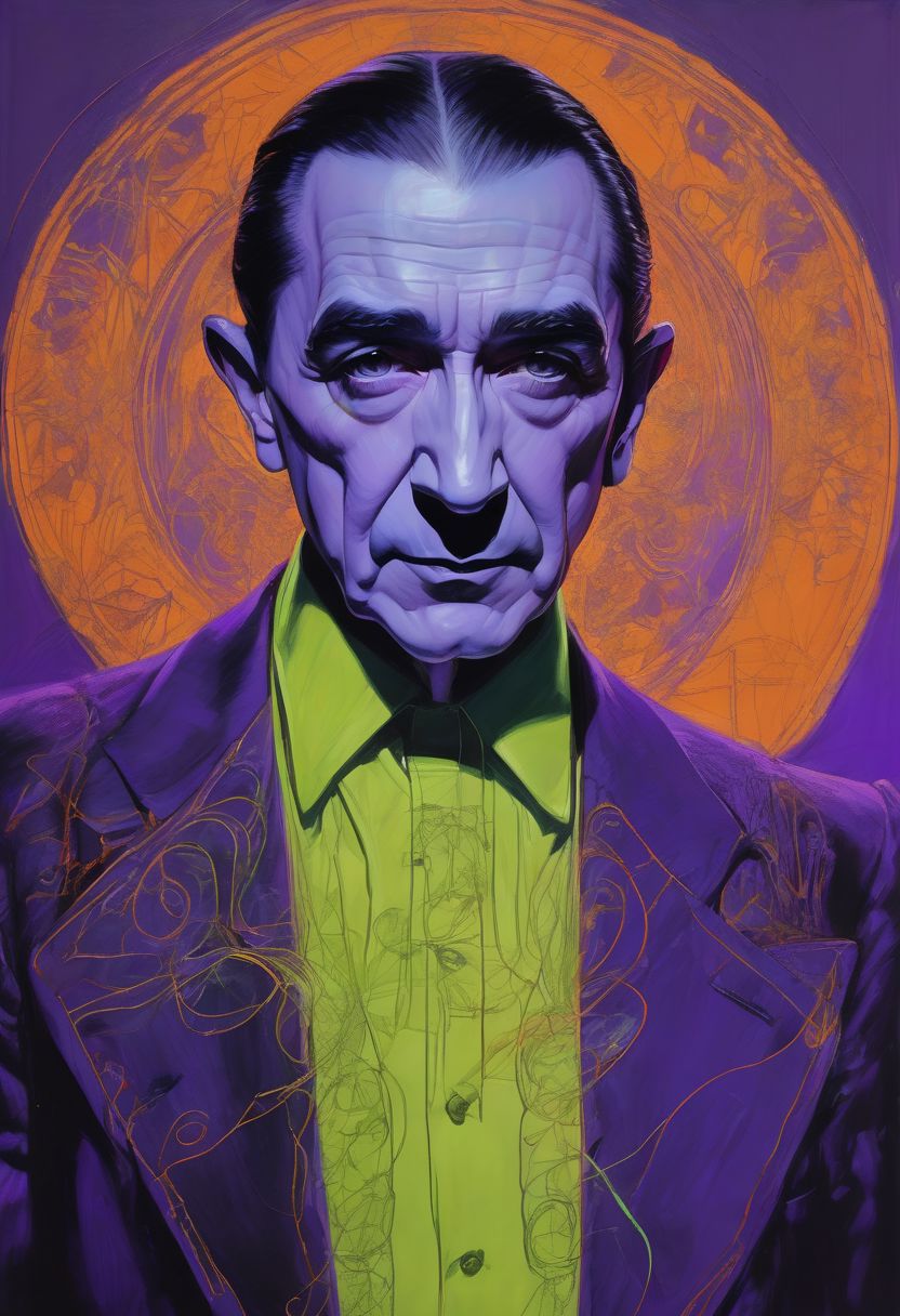 Hyperintricate art nouveau, baroque, caricature sketch of Bela Lugosi, lost in emotion and dread, ultrarealism, hyperdetail vantablack on electric purple with chartreuse and neon glow orange lines photoluminescent by Ken dallmier in the style of Carne Griffiths and James Christensen
