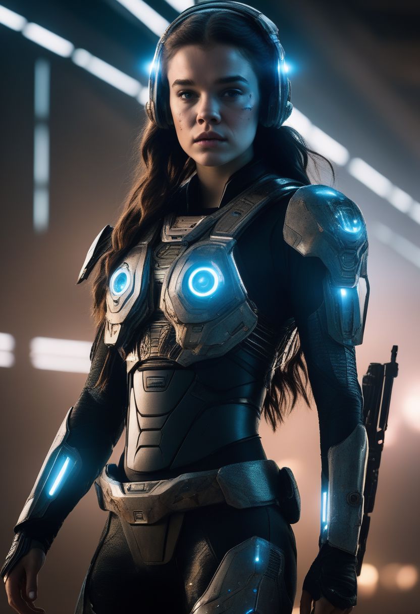 A captivating full-body portrait of a stunning cyborg warrior, played by Hailee Steinfeld, Mila Kunis, or Katherine Langford, with a damaged and scratched armor, and bruised and bleeding limbs. The character is holding a futuristic sci-fi rifle, and her holographic visor emits a neon blue glow, enhancing her cybernetic appearance. The behind-the-scenes RAW photograph showcases ultra-high-resolution, photorealistic details, with a cinematic look and insane details. The space setting is epically designed, with a futuristic advanced spaceship, a supernova explosion in the background, and a vast starry cosmos. The planet's surface can be seen through the spaceship's window, adding to the space-style ambiance. The warrior gazes intently at the