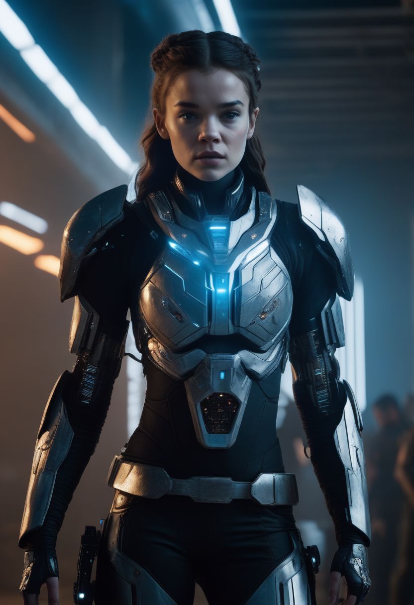 A captivating full-body portrait of a stunning cyborg warrior, played by Hailee Steinfeld, Mila Kunis, or Katherine Langford, with a damaged and scratched armor, and bruised and bleeding limbs. The character is holding a futuristic sci-fi rifle, and her holographic visor emits a neon blue glow, enhancing her cybernetic appearance. The behind-the-scenes RAW photograph showcases ultra-high-resolution, photorealistic details, with a cinematic look and insane details. The space setting is epically designed, with a futuristic advanced spaceship, a supernova explosion in the background, and a vast starry cosmos. The planet's surface can be seen through the spaceship's window, adding to the space-style ambiance. The warrior gazes intently at the