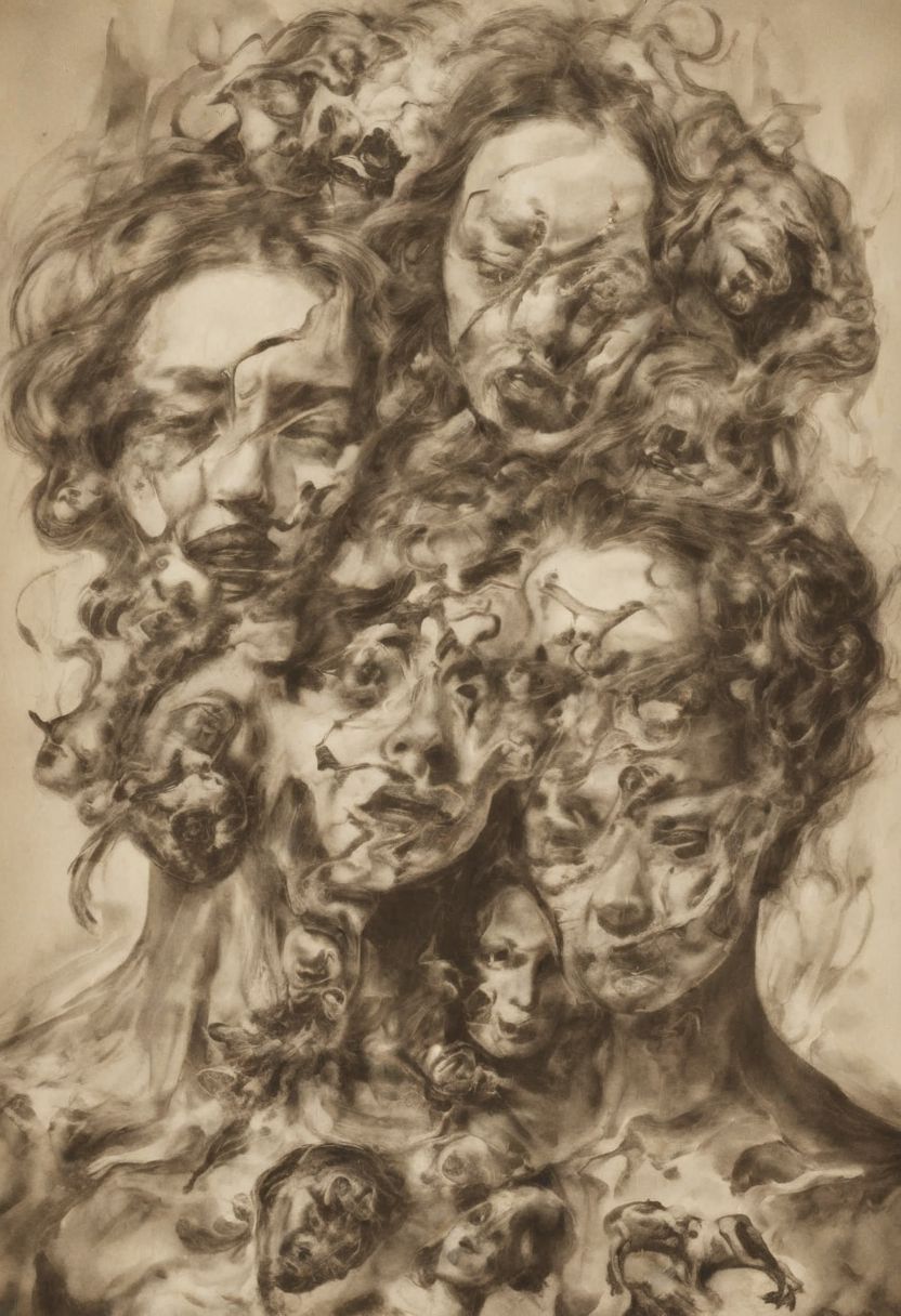 <lora:SDXL_distortion_Sa_May:1>, <lora:V1nt4geKn0ck3rs_v2:0.5>, specular distortion, cursed complex sepia psychedelic painting of a woman with multiple heads, she is disguised in clown, evil look on her face, ants are serving her ice creams, the world is freezing, nuclear wasteland