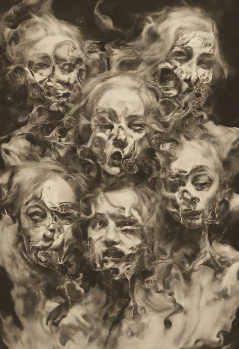 <lora:SDXL_distortion_Sa_May:1>, <lora:V1nt4geKn0ck3rs_v2:0.5>, specular distortion, cursed complex sepia psychedelic painting of a woman with multiple heads, she is disguised in clown, evil look on her face, ants are serving her ice creams, the world is freezing, nuclear wasteland