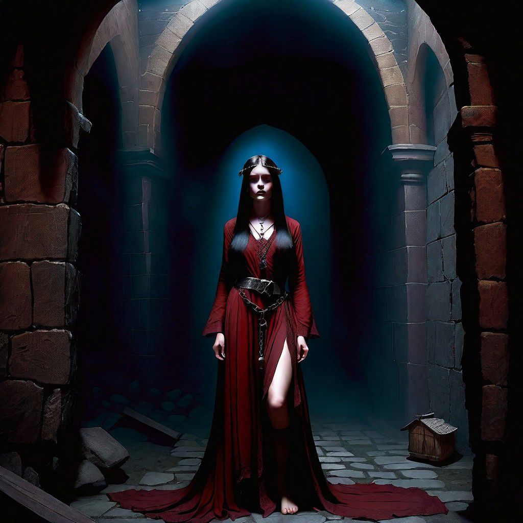 1 woman, fullbody , front view , realistic girl, cute face, parted lips, Fine and tender face, adult woman, long straight hair, long fringe, pale skin, wearing medieval red very torn dress, blue eyes, dark marron hair, girl chained inside a dungeon, Uncombed long hair