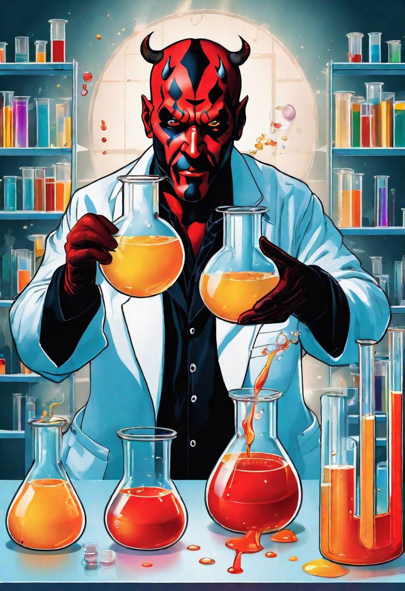 Vector t-shirt design, Darth Maul as a science professor mixing liquids from beakers and test tubes in the laboratory, light background, books and test tubes are flying in the background, reality style design, 3d render, 4k,, vibrant, poster, product, illustration, fashion, painting, colorful, graffiti style, Mysterious
