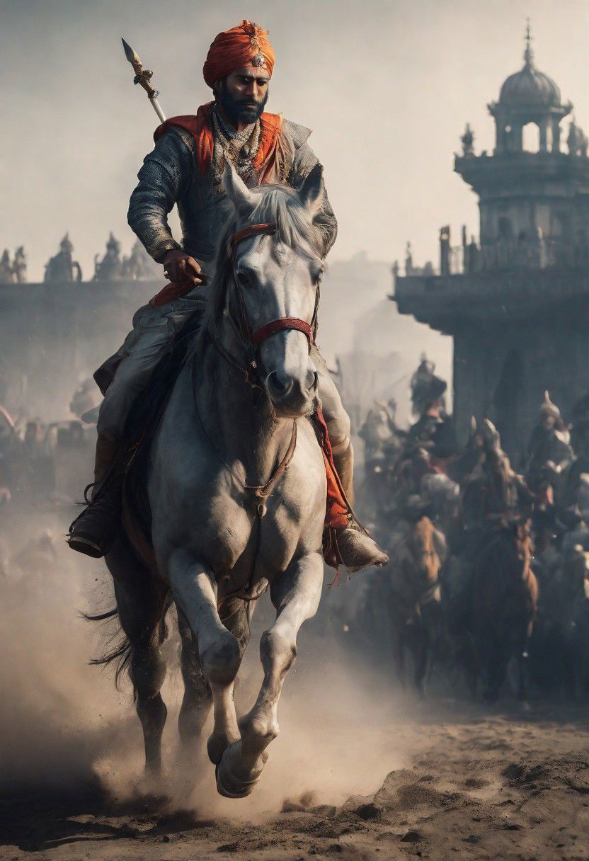 photo of the warrior chatrapati shivaji maharaj from Maratha kingdom riding horse and fighting vigorously with mughal kings, India, film grain, cinematic film still, 8k hd, portrait, dark and gritty fantasy film heavy chalk smoke, cinematic lighting