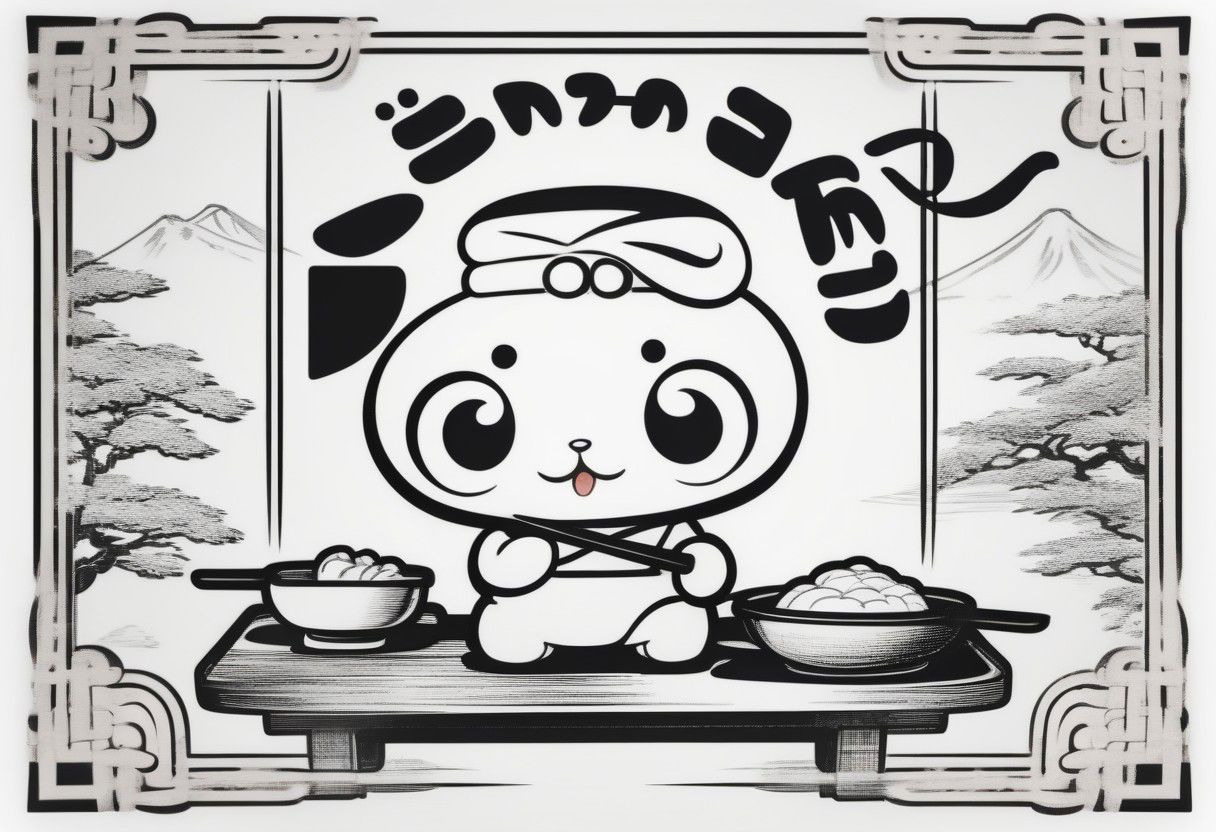 elements of the corporate identity of the Japanese restaurant Mochi, the restaurant is named after the cartoon character of the Japanese dessert Mochi with big cute eyes, around the perimeter there is an inscription with the name of the restaurant "Mochi", Japanese engraving style, monochrome, design by Katsushiki Hokusai, minimalism, super realistic, 4k resolution,