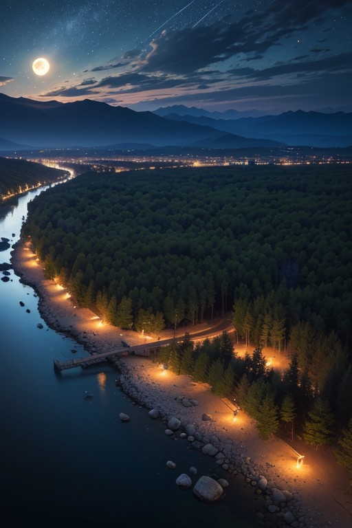 River,Mountains,forests,full moon, clouds, beautiful sky, night, epic landscape, desolate atmosphere, from above, photorealistic, masterpiece, 64k, UHD, ultra detailed, vivid colors, high quality, sharp focus