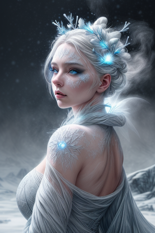 award-winning photograph, Push boundaries of traditional concepts, detailed, award-winning, professional, highly detailed, highly realistic, Frostpunk Fashion Photography, white glacial blue, smoked eye shadow, glacial makeup art, illuminated white bulging biomorphic dot pattern, glacial landscape, glacial flowers, bokeh snowflakes, (volumetric particle dust), powdered paint pigment, vivid color, misty aether houte-couture glacial clothing, etherial lighting, backlighting, professional ominous concept art, an intricate, elegant, highly detailed digital painting, concept art, smooth, sharp focus, mystic background, lots of snow floating around, <lora:add_detail:1.8>