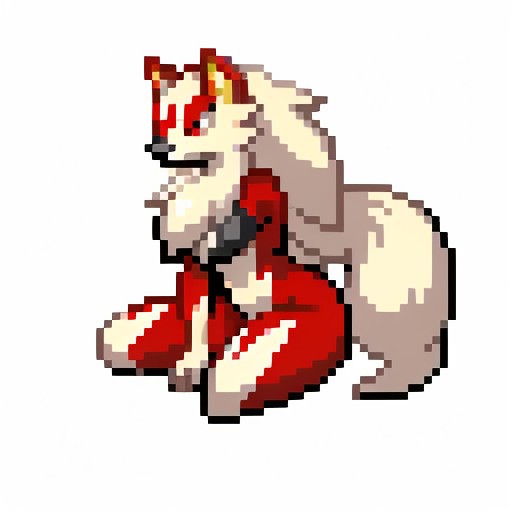 high quality, best quality, (masterpiece:1.05), front sprite, three-quarter view, full body, feet, (front:1.05), (full body:1.05), pixel, pixelart, (front view, standing up, fighting:1.05), (single, solo, alone, individual:1.05), <lora:pksp768_V2-1:0.5>, shiny, pokemon, gen5, (steel type, monster:1.08), biped, huge breasts, (creature:0.6), (white background:1.1), Lycanroc, Midnight Lycanroc, Arcanine, hybrid