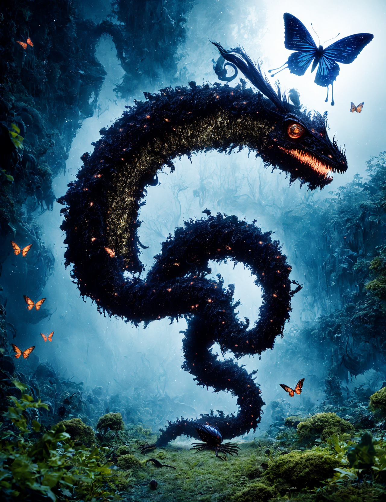 masterpiece, awesome quality, hyper detailed, DonMN1gh7d3m0n night demon fusion of Mokele-Mbembe,butterfly,assassin bug,spadefoot toad,nocturnomaths , <lora:DonMN1gh7d3m0n-000006:1>