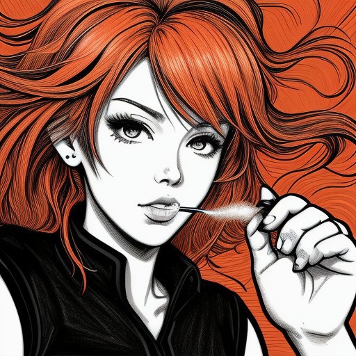 ink. Pencil black and white Beautiful girl redhead anime style. Anime style. Smoking. Mature content. Black, white, red, orange colors. Shapes and dynamic in background Outlines -- --