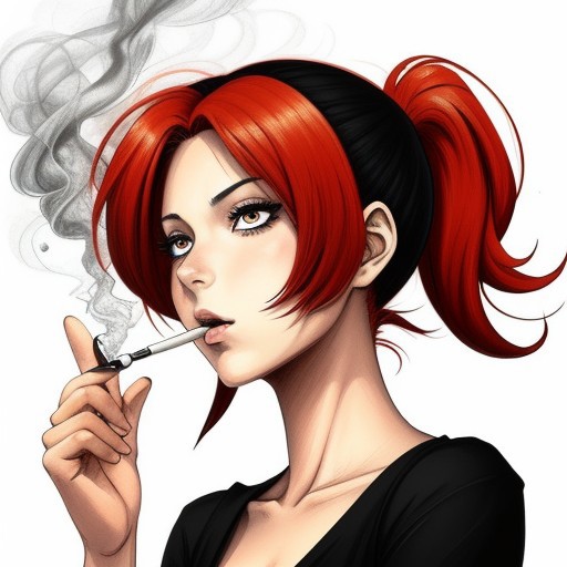 ink. Pencil black and white Beautiful girl redhead anime style. Anime style. Smoking. Mature content. Black, white, red, orange colors. Shapes and dynamic in background Outlines -- --