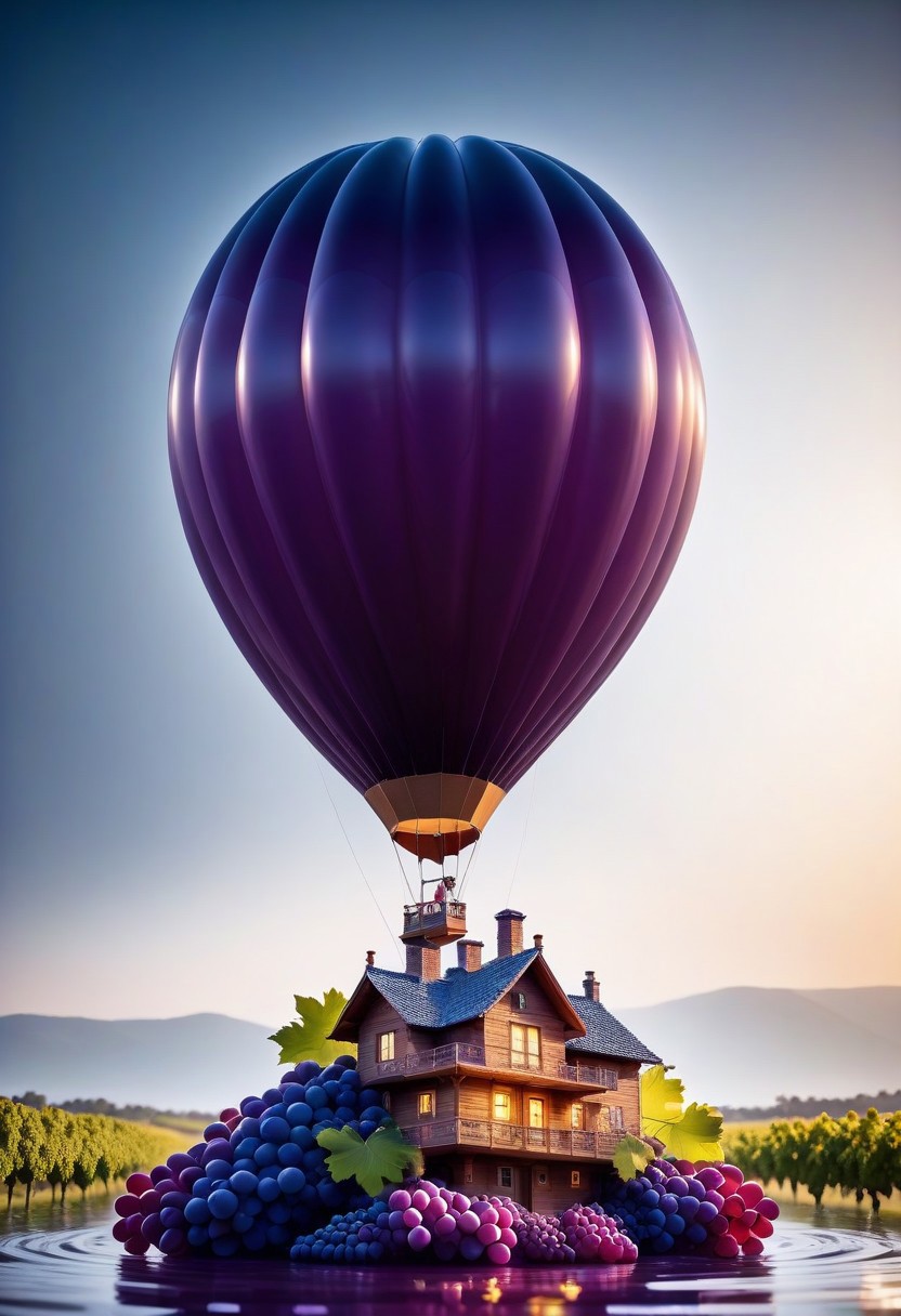 wide view,balloon,travel on a balloon,grape-shaped balloon, dynamic lighting,cinematic lighting, professional lighting,