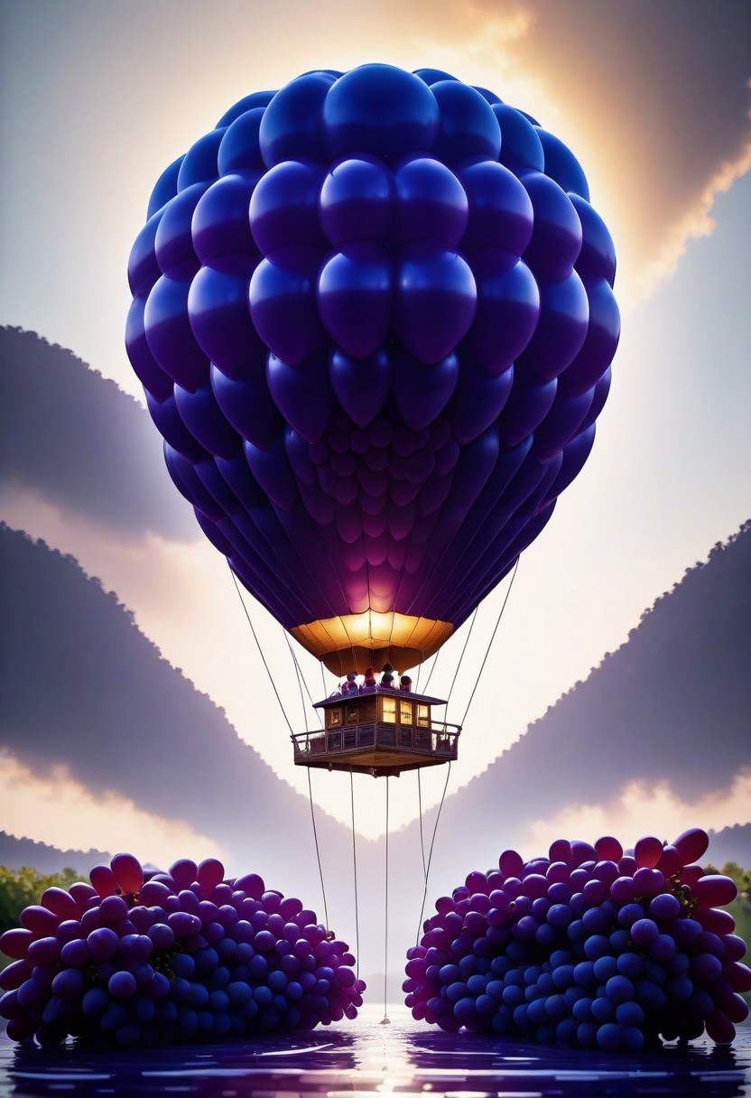 wide view,balloon,travel on a balloon,grape-shaped balloon, dynamic lighting,cinematic lighting, professional lighting,