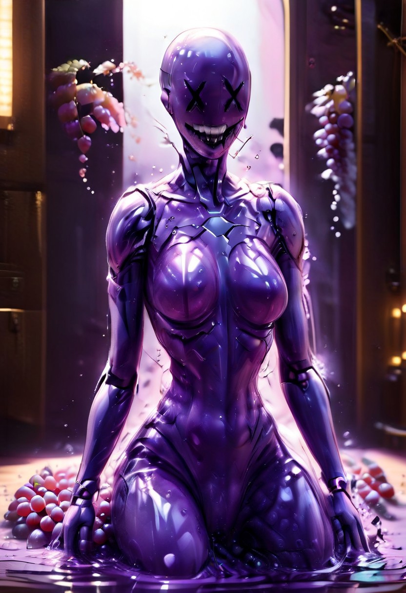 score_9, score_8_up, score_7_up, source_realistic, hyper-realistic details, extreme photorealism, high quality v3, (ultra-HD details), An purple grape cyborg bald faceless XXDFace female mannequin robot with thick bold crossed stitched x-eyes, big creepy stitched fanged smile, robot skin mecha armor with a goddess-like presence, laying in a bathtub with purple grape liquid and purple walls and glass grape columns and glowing purple engravings, illuminated by soft, mystical purple light. The atmosphere is divine and futuristic, blending ancient elegance with advanced technology, creating a surreal and awe-inspiring scene. Cinematic composition with photorealistic textures.
