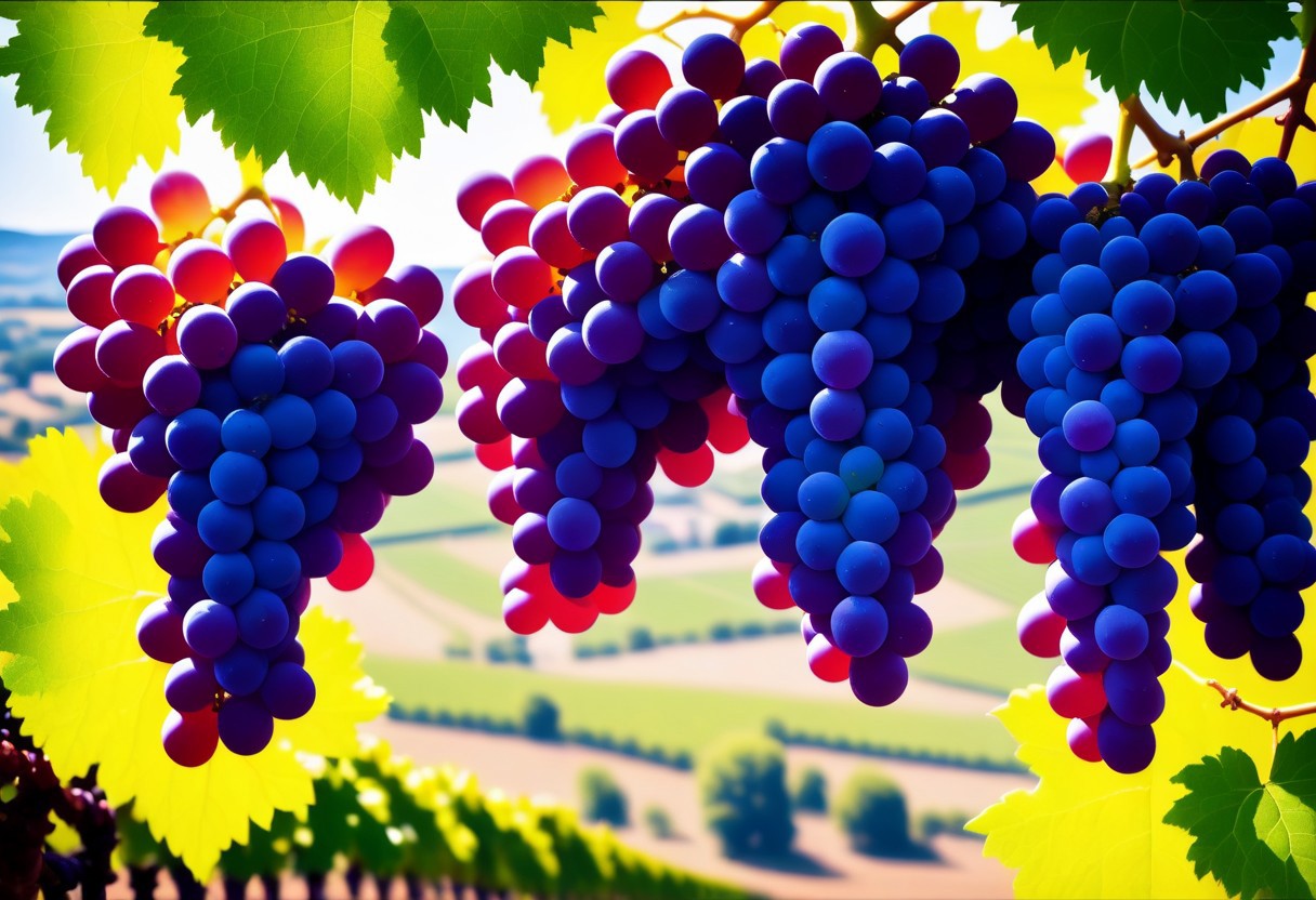 Vast fields of grapes covering the French countryside, Grapes, farm, France, countryside, farmland, vineyard, fields of grapes, grapes everywhere, best quality, realistic, captivating, fantastical, splash art, intricately detailed, hyper detailed, maximalist style, photo realistic, sharp focus, harmony, serenity, calm, mysterious glow, dynamic lighting, superb composition, finest details, highest aesthetics, ((view from above)), aerial photo from above as if a bird had taken the picture, mystical glow, best quality, sharp focus, high contrast, stylized, clear, colorful, ultra quality, 8k, best quality, masterpiece,