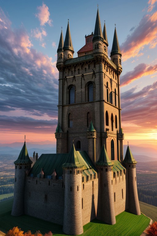 Masterpiece, best quality, UHD, 16k, high res, high detailed, medieval fantasy tower spiraling towards the sky, daylight sun touches the landscape, colorful sky