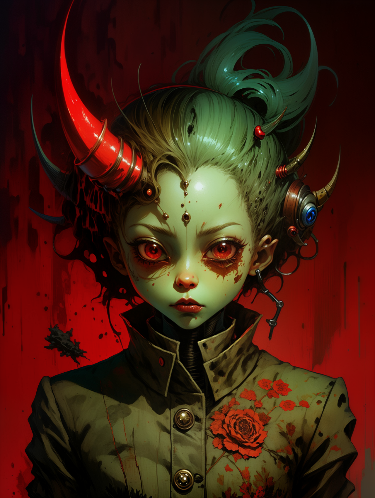 ( art by Gainax), (Evil Goddess:1.2),(hyperdetailed:1.1), (intricate details:1.0), (Refined details:1.1), (best quality:1.1), (high resolution:1.2), artistic aesthetics, excellent composition, dynamic angle