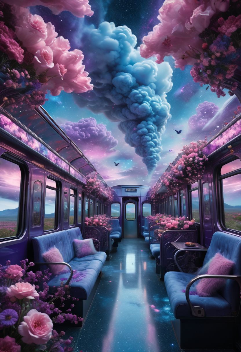 Hyperrealistic train detailed with blooming flowers, ethereal cloud animals with shimmering outlines, passengers gazing in awe, vast sky with swirling galaxies, cosmic colors (purples, blues, pinks), dramatic lighting, mystical atmosphere