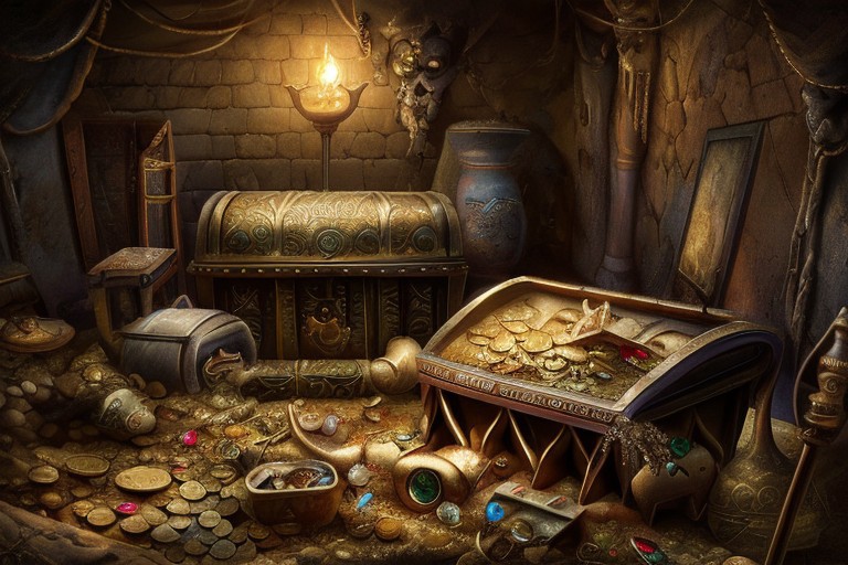 RAW photo, (masterpiece:1.3), subsurface scattering, heavy shadow, (high quality:1.4), (intricate, high detail:1.2), professional photography, HDR, High Dynamic Range, realistic, ultra realistic, photorealistic, high resolution, film photography, ambient lighting, atmospheric effects, <lora:detail_slider_v4:2>, OverallDetail, <lora:TreasureHoard:1>, book, carpet, coin, gem, indoors, necklace, scenery, shield, skull, treasure chest, treho, weapon