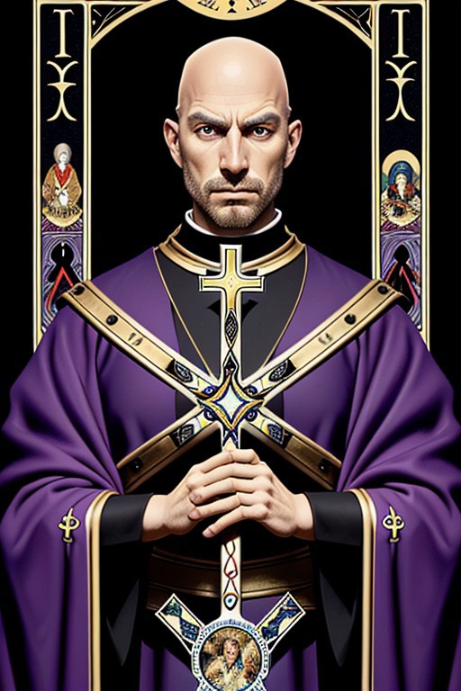 <lora:tarot-electronicdetails:1.0>, tarot card, a man, bishop, bald, cleric, purple dress, tiara, clothes with LED accents || masterpiece, perfect quality, sharp focus, shallow depth of field, 8k